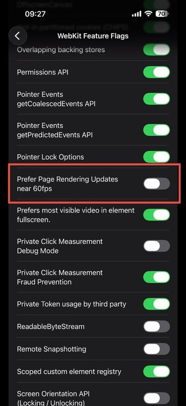 Settings → Apps → Safari → Advanced → Feature Flags → Toggle OFF Prefer Page Rendering Updates near 60fps